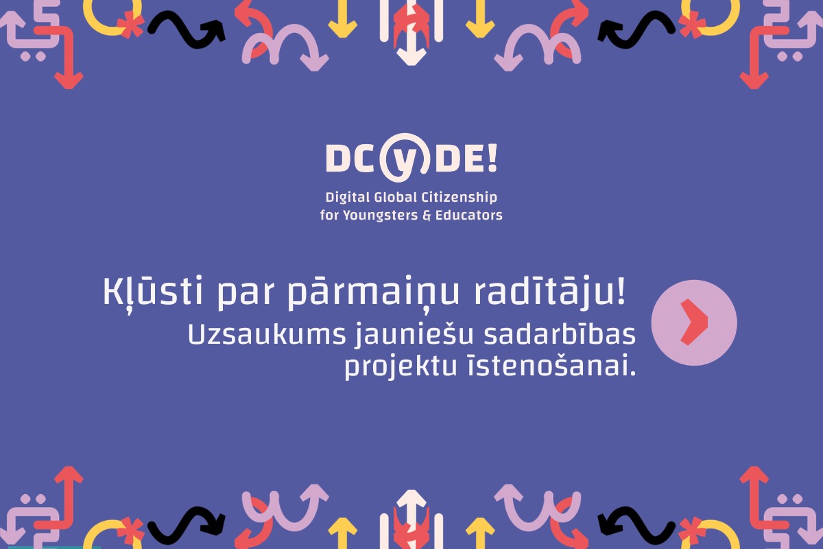 Vai Tu tici, ka jaunieši ir tie, kuri var veidot ilgtspējīgāku un taisnīgāku pasauli? Vai esi gatavs atbalstīt radošas idejas un palīdzēt tām pārtapt reālos darbos? Projekts DCYDE! aicina aktīvus jaunatnes darbiniekus, skolotājus, NVO darboņus un izglītotājus organizēt starptautiskas jauniešu (15–30 gadi) sadarbības norises!